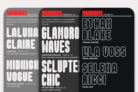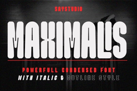 Maximalis Font is a condensed sans-serif typeface created for use in bold headlines with distinctive shapes that make it a display font for easy reading in contemporary use. Available in regular, condensed, outline, and italic styles, the shapes are easy to read and expressive. Its glyph catalog provides an easy-to-compose system for Latin with a tall x-height and tight line spacing.