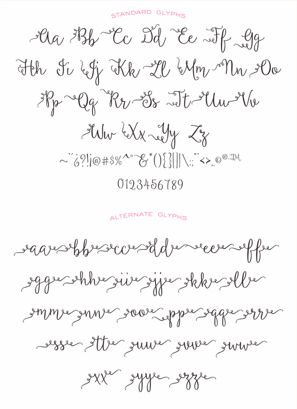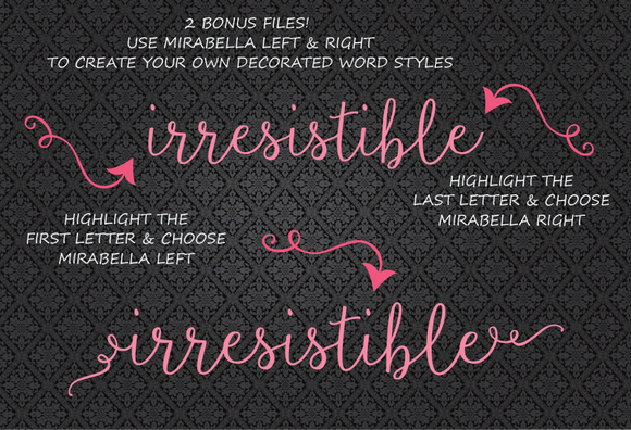 The Mirabella script ALSO includes two additional ornamental extras. A left font extension and a right font extension. These two extra typefaces help finish your beautifully typed project in a curly whirly. See image two above for a real example