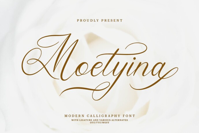 Moetyina Font | Modern Calligraphy Font, from Denustudios, suitable for any projects such as: logos, branding projects, homeware designs, product packaging, mugs, quotes, posters, shopping bags, t-shirts, book covers, name card, invitation cards, greeting cards, label, photography, watermark, special events, and all your other lovely projects that need a Modern Calligraphy Font taste.