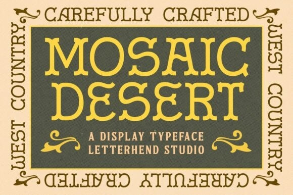 Mosaic Dessertd Font! A Classic Wild West style font, ready to rock! Suitable for design needs with a touch of classic western and also suitable to be applied especially in logo, and the other various formal forms such as invitations, labels, logos, magazines, books, greeting / wedding cards, packaging, fashion, make up, stationery, novels, labels or any type of advertising purpose.