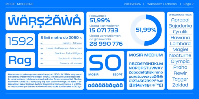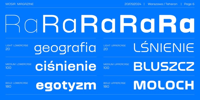 Mosir Font – The history of this typeface begins in Iran, where I came across the “TECHNO” shop display while there. I liked the brutalist and geometric forms in this typeface and started sketching. After attending to “SOLEC GYM” for some time, I finally appreciated the craftsmanship with which the neon sign above the entrance was designed. The pieces of the puzzle finally came together and that’s how MOSIR came to be. The type family features a modular design with rounded details that look either thoroughly modern or completely old-school, depending on the company. MOSIR has 5 weights and will work well where we are looking for a strong geometric character with a friendly aesthetic. Karol Mularczyk and Małgorzata Bartosik worked on the project under the creative direction of Mateusz Machalski.
