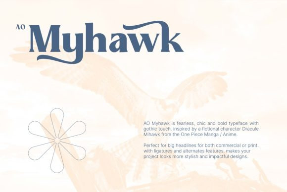 AO Myhawk is a fearless, chic, and bold typeface with a gothic touch. Inspired by a fictional character Dracule Mihawk from the One Piece Manga / Anime. Perfect for big headlines it will make your project look more stylish and impactful.