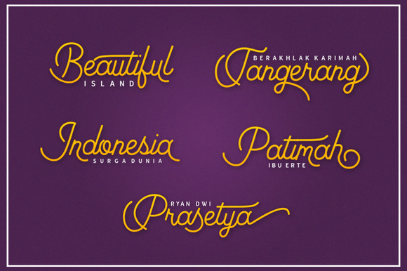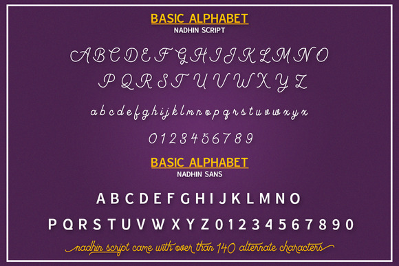 Nadhin is new typeface, come with 2 versions Nadhin Script & Sans. Nadhin Script is mono script font with elegant, vintage and modern look. Nadhin Script covered all Uppercase, lowercase, numeral, punctuation & come with 142 Alternate.