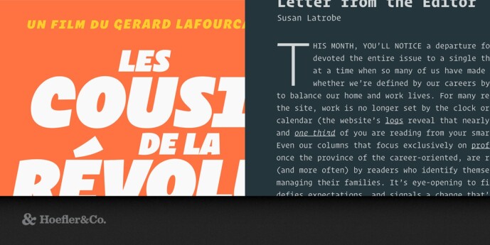 But actual typewriter faces are notoriously difficult to work with. They never have the broad range of weights that designers need (let alone features like small caps), and their italics are rarely either distinctive or interesting. Their fixed-width construction — the requirement that each letter have the same horizontal dimension — gives them their interesting and recognizable artifacts (an I with long serifs, a squeezed M, and so on), but also disrupts the rhythm of text. What a designer ideally needs is a fully-fledged family of typefaces with the voice of typewriting, but none of its limitations, which is why we designed Operator.