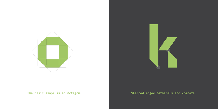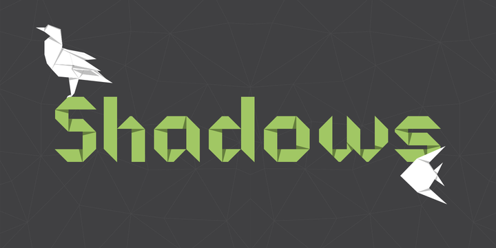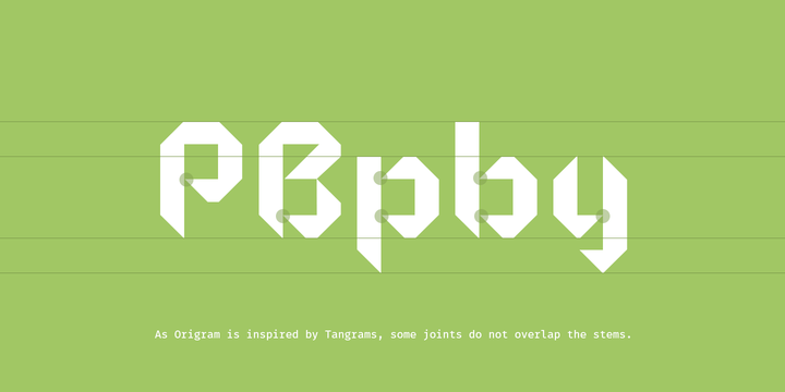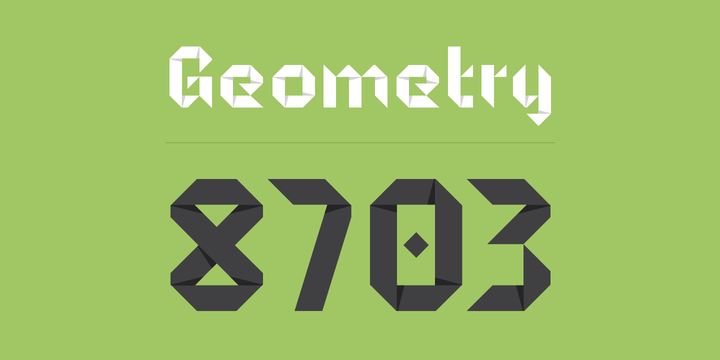 Inspired in the Origami and Tangram tradition, the basic shape is an octagon. Geometrical and regular, resulting in a neat and captivating display font. Not particularly conceived to be used in common text, this stylized font will add value to any large scale image within the realm of logos & branding, outdoors, packaging, titles, magazines, posters, signs, shirts, scrap-booking… Your imagination is the limit.