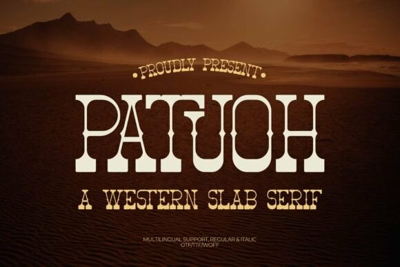 Patuoh Font is a typeface called a Western Slab Serif. It has a bold, sturdy look with thick lines and square edges. This style is often used in old Western movies and posters. Patuoh gives a strong, classic feel to any text, making it stand out clearly.