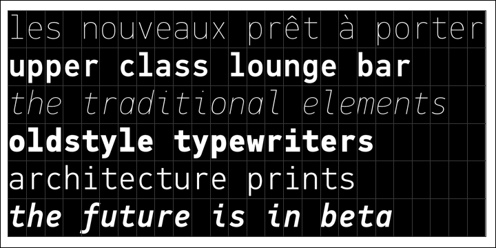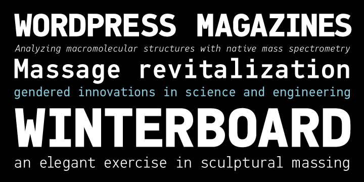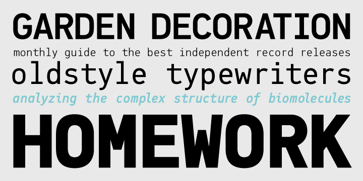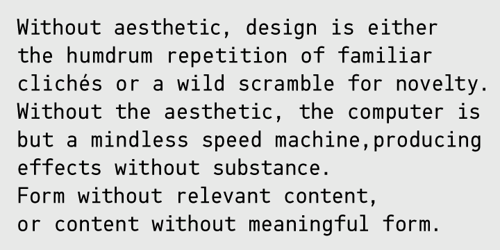Traditionally, monospaced fonts have been used to create forms, tables and documents that require exact text line lengths and precise character alignment. DIN Mono, on the other hand, can prove to be more than a useful typeface for technical applications. In the world of proportionality, DIN Mono stands out as a fresh new alternative to the popular standard, particularly for publishing and branding applications. Additional care was given to the aesthetic form and its pleasing characteristics. The spacing attributes of the glyphs were redefined and legibility was further improved by revising or changing the shape of the letterforms. Furthermore, kerning was not included in order to preserve the monospace nature of this typeface. More…