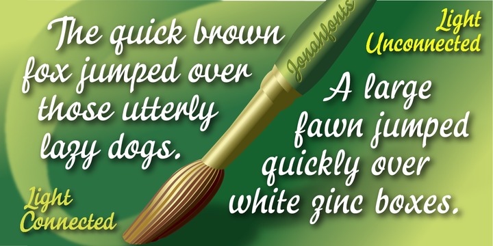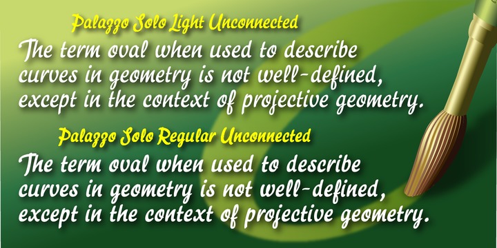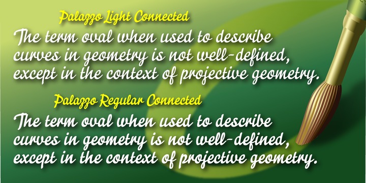 An oval-brush-script with some opentype discretionary ligatures along with other ligatures and fractions. Palazzo Solo is the same as Palazzo Regular but is an unconnected version.