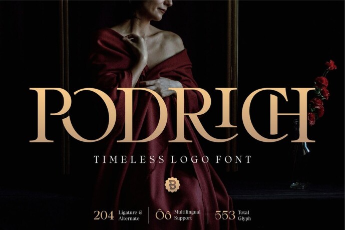 Podrich is an elegant timeless serif logo font that evokes sophistication, classic, and a sense of refined luxury. It features significant contrast between thick and thin strokes, enhancing legibility and a luxurious look. It features a lot of alternates and ligatures to complement your design needs. It is perfect for desired logos, poster designs, fashion, and premium branding due its ability to convey sophistication, heritage, and quality.