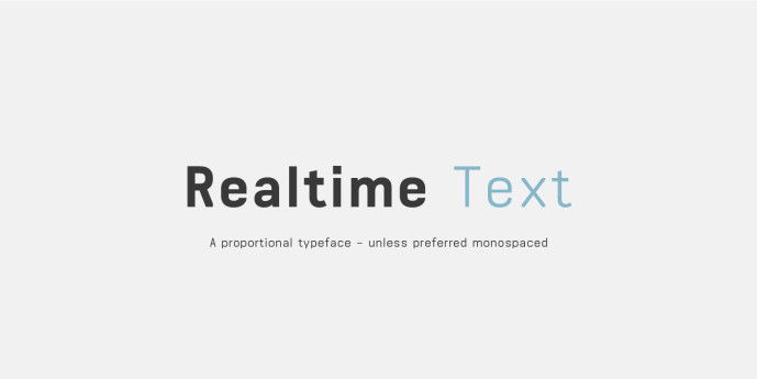 Realtime Text Font Family is the proportional alternative to the monospaced Realtime type family. Nevertheless Realtime Text includes a monospaced design already built into the font. It is employable through OpenType by activating alternate characters. Realtime Text is a technical yet friendly design with details that serve function and visual impact alike and lends itself to tabular designs, sturdy columns and tidy layouts. It comes in five weights, from light to black, and with a character set that covers over 200 latin languages.