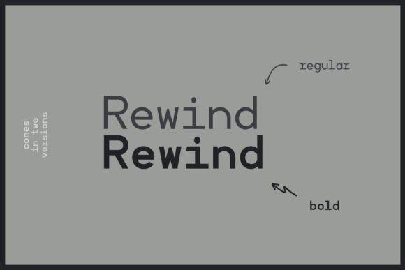 Rewind is a technical monospaced sans-serif typeface. The font was inspired by 1980s portable cassette players. Rewind has an industrial vibe, which makes it great for branding, technology projects, social media, stationary, packaging, airline industry, subtitles for movies, ads, and more.