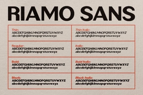 Riamo Sans Font Family, an expertly designed Sans Serif typeface. Boasting a rare balance of yesteryear’s charisma and modern finesse, this font takes versatility to new heights. Four distinct weights breathe added dynamism into your design canvas, lending a new dimension and versatility to your craft. Expanded and italic versions further enrich its stylistic scope. Riamo Sans is not simply a font, it’s an artistic statement that resonates the beautiful amalgamation of past and present. Surrender to the charm of Riamo Sans, and add sophistication to your creative journey.