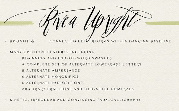 The Rivea Family is a two-font, hand-lettered script family designed to mimic real calligraphy. Each font dances along a natural, variable baseline and has a distinctive slant. Long, thin upstrokes contrast with rich downstrokes in a style reminiscent of “wet noodle” pen writing.