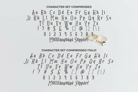 Ruby Ring Font is a unique slab serif display font that packs in six styles: Regular, Italic, Compressed, Compressed Italic, Condensed, and Condensed Italic. This type of font gives a modern impression and feels expensive. Its unique, tall shape is adapted from a serif base so it will suit any industry, such as accessories, author, café, event organizing, fashion, furniture, handicraft, honey manufacturers, jewelry, photography, pottery, printing, publishing, restaurant, wedding, and many more.