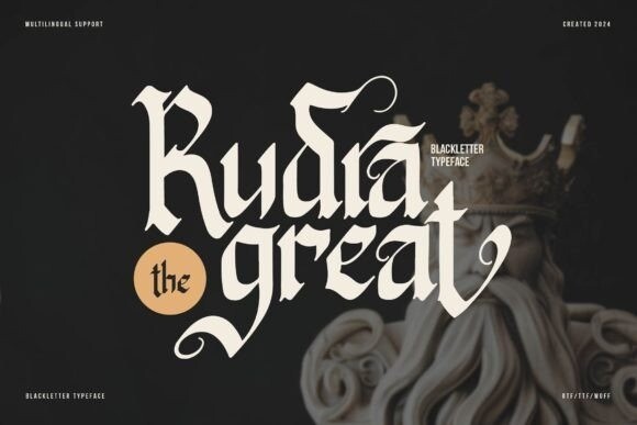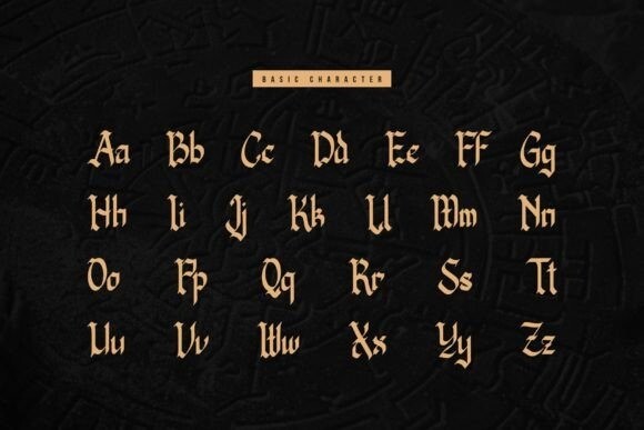Rudra Great Font is a bold and decorative Blackletter typeface. It has a strong and traditional look, with sharp edges and thick lines. Perfect for posters, logos, or designs needing a classic and powerful style.
