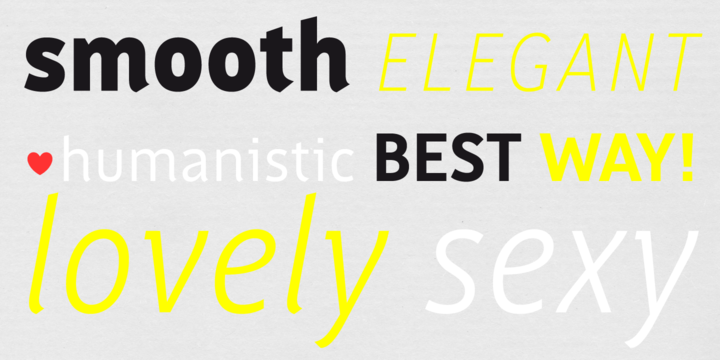 Saya FY is a fresh sans serif font suitable for text and display use. The lightly condensed letterforms are built up of a harmonized mix between well rounded curves and pointed endings. These calligraphic details afford a unified structure in small size and elegant shapes in larger sizes.