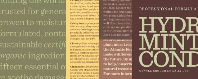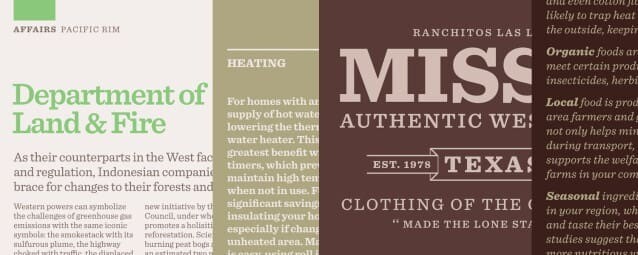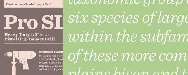 Planned from the outset to flourish in small sizes as well as large, Sentinel contains features like short-ranging figures that make it a dependable choice for text. And most mercifully, it includes thoughtfully designed italics across its entire range of weights.