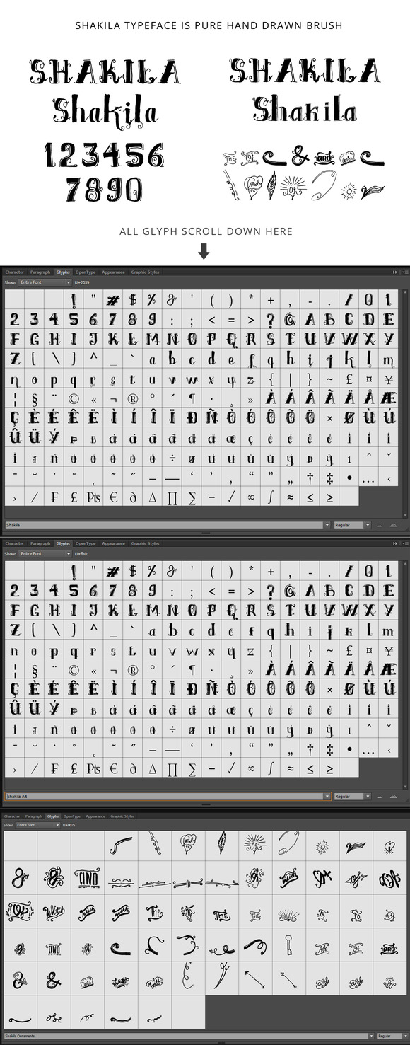 - Ready to use “Shakila Typeface Hand Drawn Ornaments” for Awesome Work