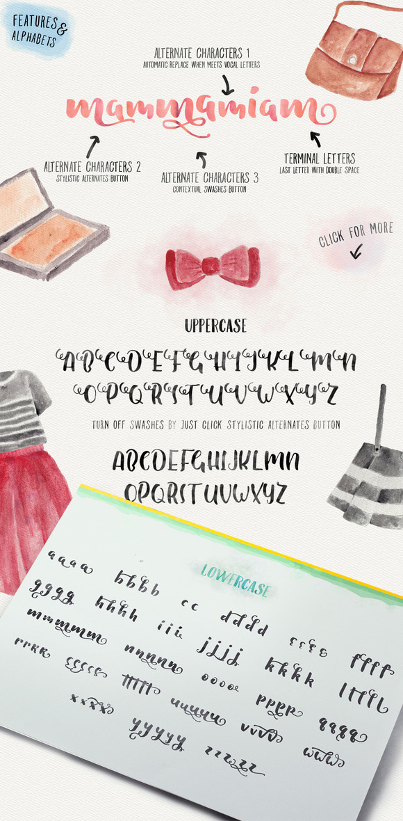 Brand new hand drawn typeface with brush and ink with touch modern calligraphic style in alternate characters ! Comes with 5 different alternate character in most of letter. 2 sets it automatic and 3 sets as alternate character that simplified with Contextual swashes button and contextual alternates button or it can be use in glyph panel. Check the display no 2 ! more detail at http://goo.gl/oBLKpz