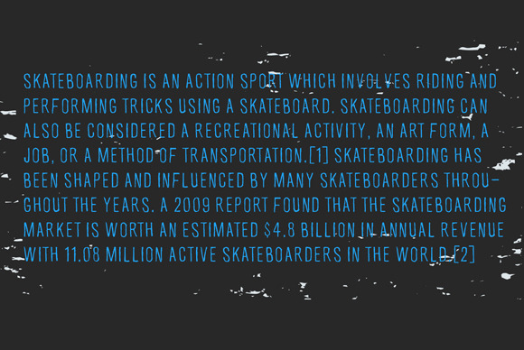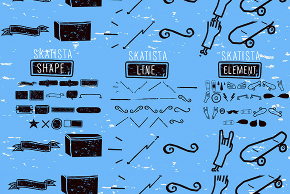 Five types to make your designs something more entertaining, inspired by skateboarding and works perfect for extreme sports -Skatista regular ( handmade) -Skatista Italic ( handmade) -Skatista Line (dingbat) -Skatista Element (dingbat) -Skatista Shape (dingbat) Thanks Rodrigo Araya Salas