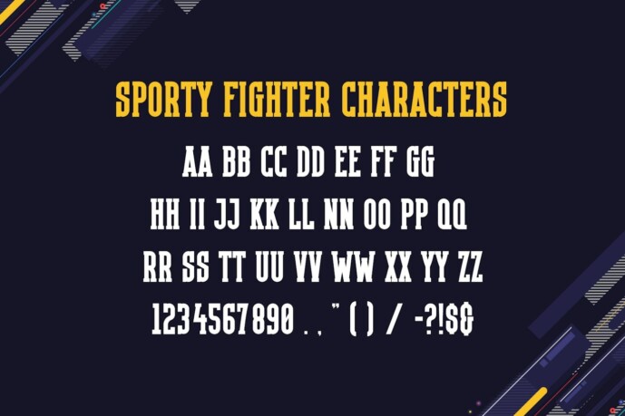 Sporty Fighter Font is a sports display font inspired by the fighting spirit and drive of athletes. This font is designed to give a strong, bold and energetic impression to your designs.