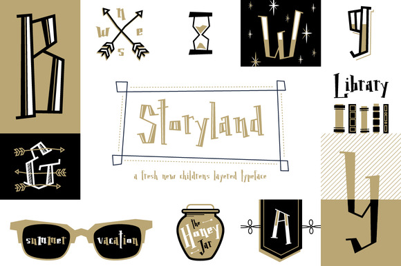 Storyland is a fun font with many layers which can be used in a variety of ways. This playful and whimsical font was originally created as text for children books and stories but can have many uses outside that realm. I have included some fairytale elements in the glyphs including different arrows, an hour glass, an “X” marks the spot as well as a second ampersand…who doesn’t like an extra ampersand. I hope you enjoy using this as much as I have creating it.