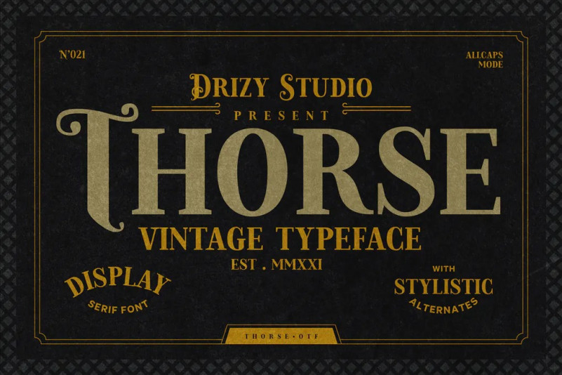 Introducing Thorse! Manly serif display font from drizy! This classy and vintage all-caps serif typeface. With upper case characters, numbers, multi language, ligature and punctuation. Perfect for gorgeous logos & titles, Thorse will pair beautifully with many fonts and work well with whatever project you’re working on.