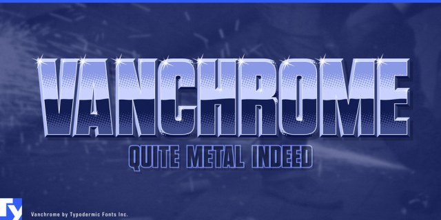 Vanchrome is a compact sans-serif headliner with chromatic layers. Create a layer in your design application, copy the layer, change the style, change the colors. Some applications such as Photoshop might need manual vertical alignment so cross-hair in the ◊ character position has been included. Due to the way Vanchrome’s bevel shading is designed, the Left and Right bevels should be placed under the Up and Down bevels. For a classic chrome effect, try the following order: Back, Front, Horizon, Ground, Sky, Left, Right, Up, Down, Grid (optional), Edge, Sparkle. Manually offset the back style to make a drop shadow. The Clear layer is designed to be used on its own or layered between Back and Sparkle layers. Greek and Cyrillic alphabets are included.