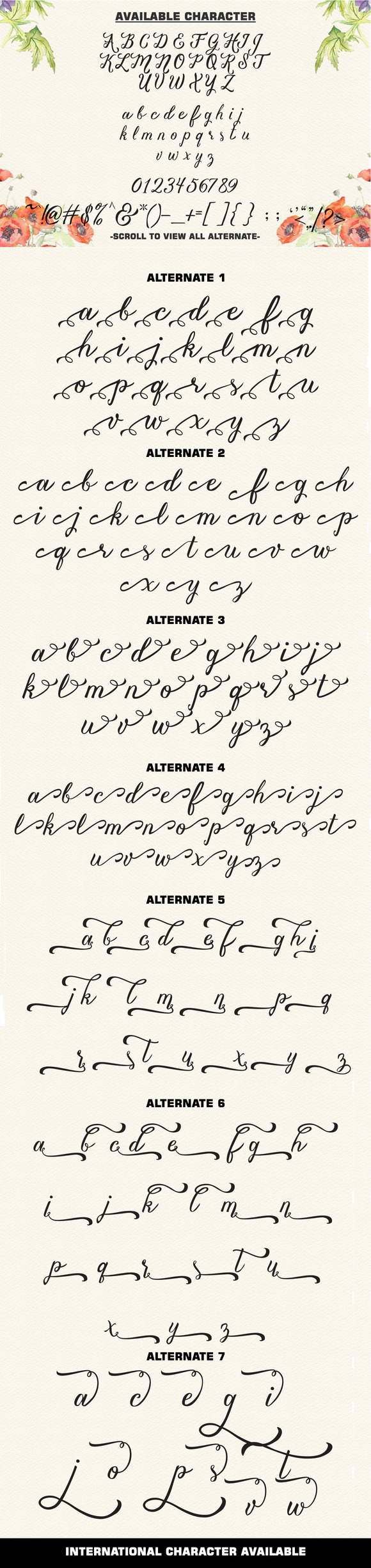 Vanessa Handscript come with 402 characters there 202 alternate characters. see all alternate on third poster to view all alternate characters.