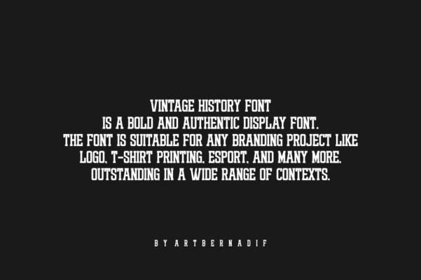 Vintage History Font – Modern Font is a bold and authentic display font. The font is suitable for all branding projects such as Logo, t-shirt printing, esports, etc. exceptional in a wide range of contexts.