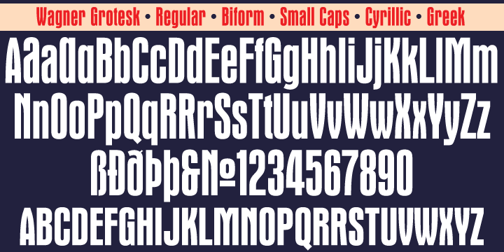 Bold, condensed, yet clear and legible, Wagner Grotesk is good for cramming information into tight spaces. Extended language support includes Western, Central and Eastern European character sets, as well as Greek, Cyrillic, Baltic, Esperanto, Maltese, Turkish, and Celtic/Welsh languages. Biform letters and small caps make Wagner Grotesk a most versatile and functional headline face.