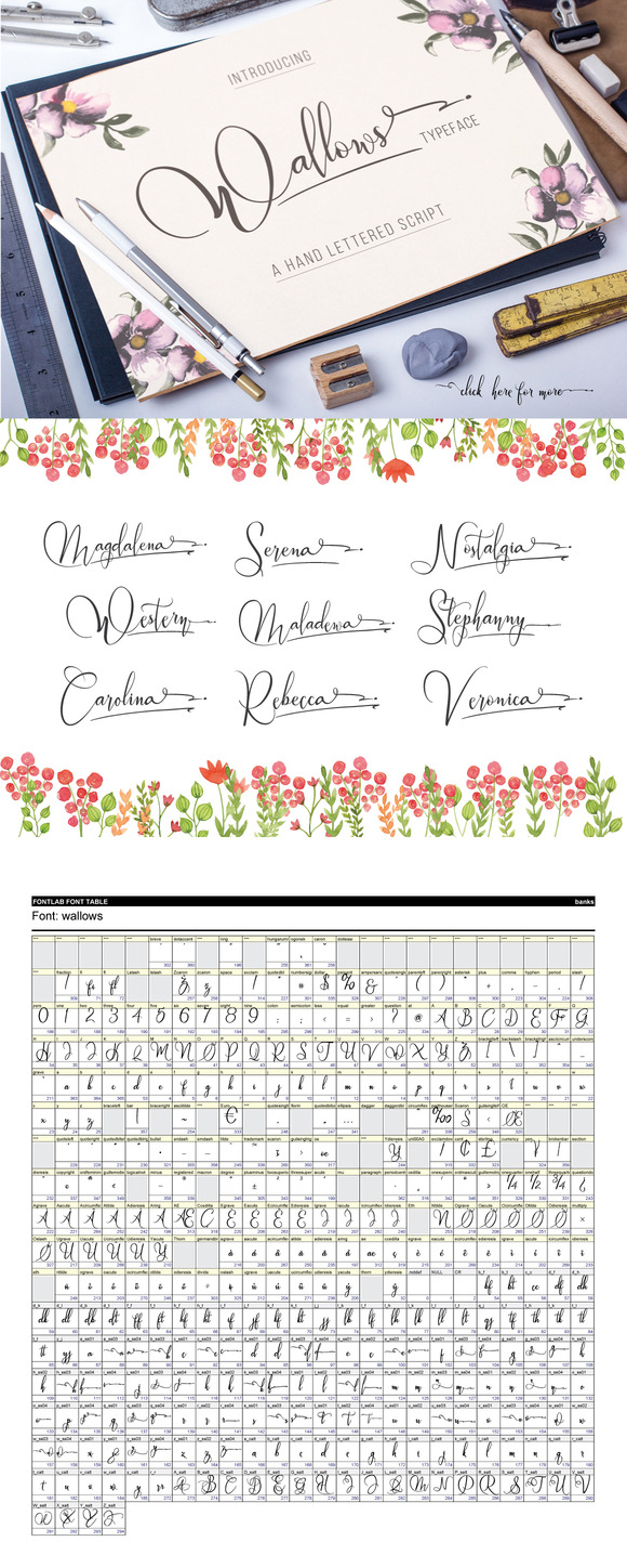 wallows is a beatiful handwriting script. Suitable for wedding invitations, greeting cards, design of water-based paints, correspondence, and a variety of other purposes.