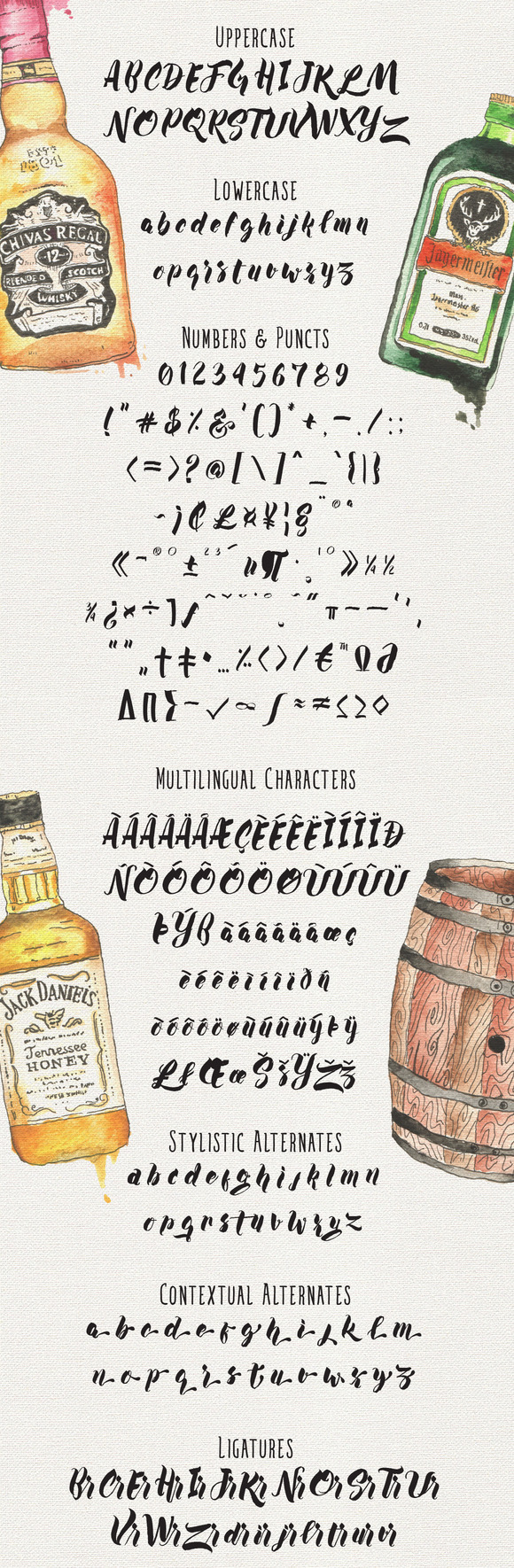 Use a program that supports OpenType features such as Adobe Illustrator CS, Adobe Indesign & CorelDraw X6-X7 to access the full features of this typeface.
