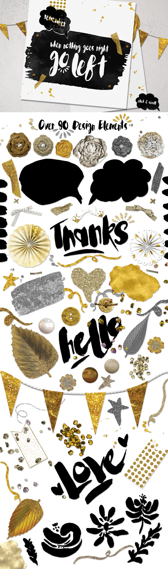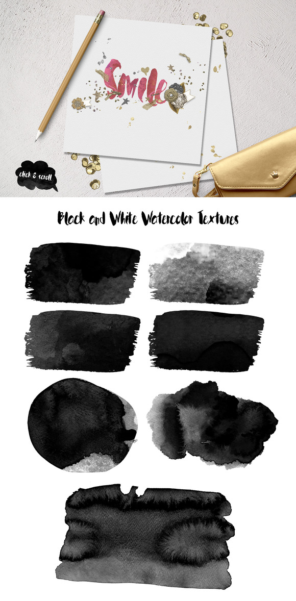 - Over 80 Design elements and some black/white watercolor textures.
