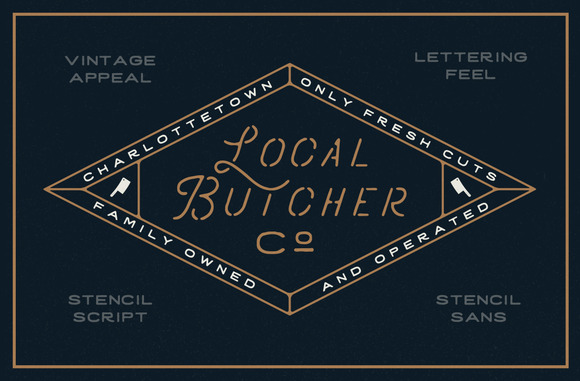I wanted to create a typeface that has a lot of distinctive character. With script style capital letters, small-caps sans type for the lowercase portion. The mixture of the two styles combined with a stencil look gives this font a 1 of a kind incredible feel. Inspired by recent lettering & vintage type projects. This typeface is perfect for: