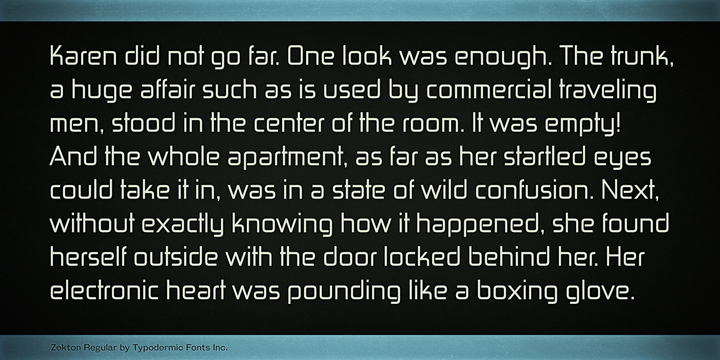Zekton was inspired by the futuristic fonts found on electronic gadgetry. Zekton imparts a serious, high-tech look by its rounded curves and even line widths.