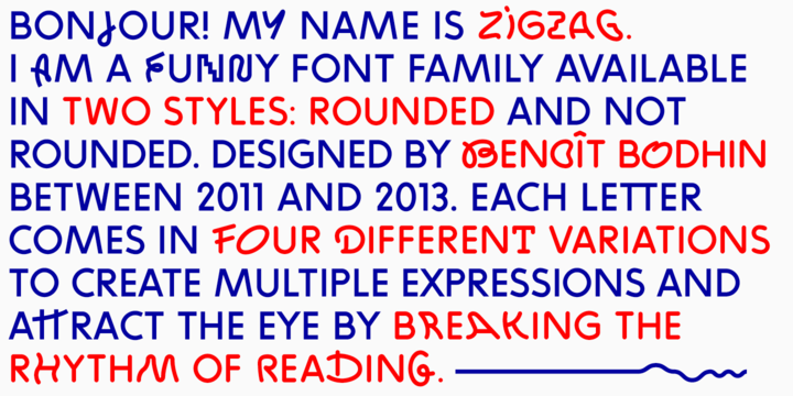 ZIGZAG is a funny font family whose letters have four varieties each in order to multiply expressions and attract the eye by breaking the rhythm of reading. There are two styles available Rounded and Not Rounded.