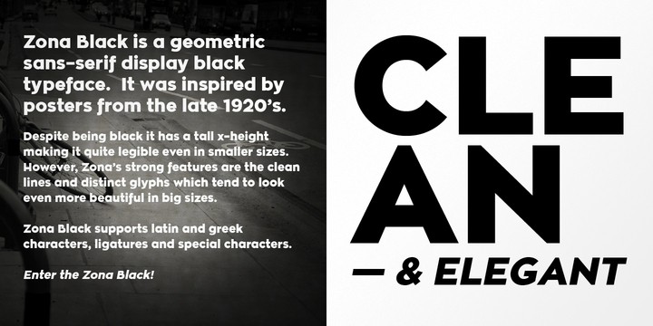 Zona Black is a geometric sans–serif display black typeface. It was inspired by typography from 1920’s posters featuring clean lines and some quite distinct glyphs such as the uppercase B and the H. Despite being black it’s tall x–height makes Zona quite legible even in smaller sizes.